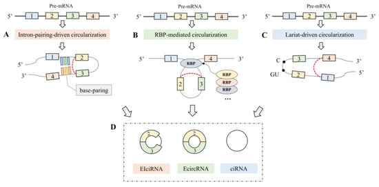Biogenesis and structures of circRNAs: (A) intron-pairing-driven circularization; (B) RBP-mediated circularization; (C) lariat-driven circularization; (D) sdifferent circRNA structures. (EIciRNA: exon–intron circRNA; EcircRNA: exonic circRNA; ciRNA: intronic circRNA).