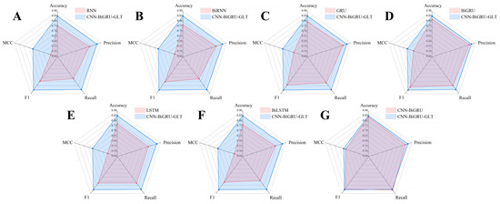 Comparison of the CNN-BiGRU-GLT model’s performance with traditional deep learning methods on validation set: (A) CNN-BiGRU-GLT and RNN performance comparison; (B) CNN-BiGRU-GLT and BiRNN performance comparison; (C) CNN-BiGRU-GLT and GRU performance comparison; (D) CNN-BiGRU-GLT and BiGRU performance comparison; (E) CNN-BiGRU-GLT and LSTM performance comparison; (F) CNN-BiGRU-GLT and BiLSTM performance comparison; (G) CNN-BiGRU-GLT and CNN-BiGRU performance comparison.