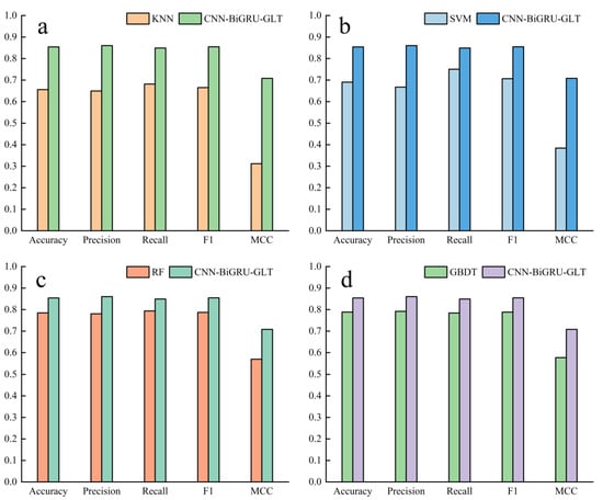 Comparison of the CNN-BiGRU-GLT model with traditional machine learning methods on validation set: (a) CNN-BiGRU-GLT and KNN performance comparison; (b) CNN-BiGRU-GLT and SVM performance comparison; (c) CNN-BiGRU-GLT and RF performance comparison; (d) CNN-BiGRU-GLT and GBDT performance comparison.