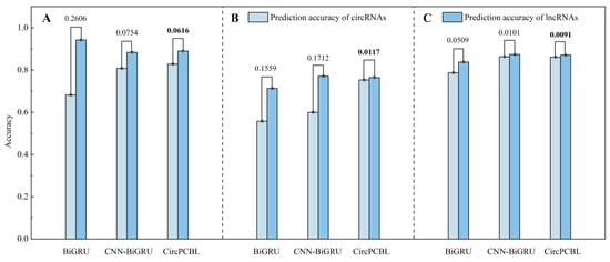 Single-class prediction accuracy with BiGRU, CNN-BiGRU, and CircPCBL models: (A) Cucumis sativus; (B) Populus trichocarpa; (C) Gossypium raimondii. The number on the bar chart indicates the prediction accuracy margin.