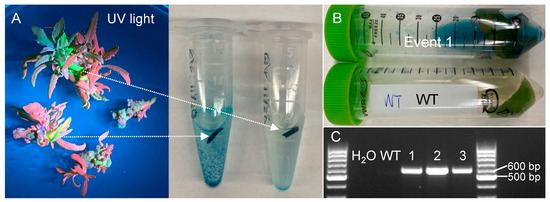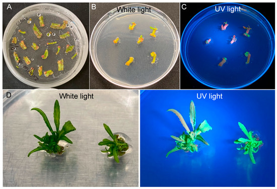 The transgenic plants were visualized using an Ultraviolet A (UVA) flashlight LIGHTFE UV302D (365 nm) (TURBO LIGHTFE, Zhongshan, China) and the method for visualization has been fully described previously [34]. The images were taken using iPhone 11 (Apple, Cupertino, CA, USA).