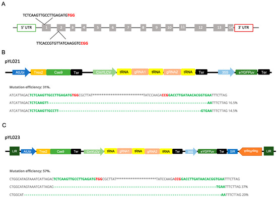 The following supporting information can be downloaded at: https://www.mdpi.com/article/10.3390/plants12081657/s1, Figure S1: Amplicons of the phytoene desaturase (PDS) target region from the 52-225 protoplast cells transformed by pYL021 and pYL023; Table S1: Plasmids used and constructed in this study; Table S2: Primers used in this study. References [33,34,66] are cited in the Supplementary Materials.