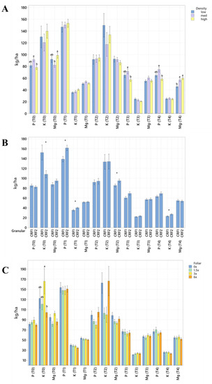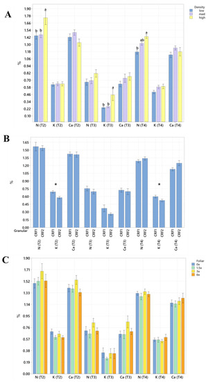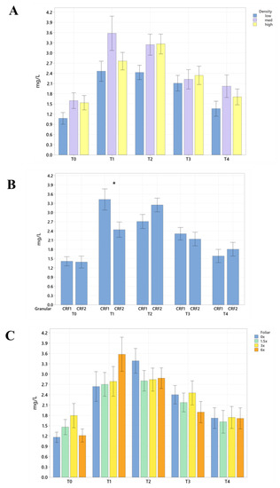 Soil macronutrient concentrations of ‘Ray Ruby’ grapefruit grafted on ‘Kuharske’ citrange planted in flatwood soils located in Fort Pierce, FL, USA, in response to (A) planting density, (B) ground-applied fertilizer and (C) foliar fertilizer treatments during September 2020 (T0), January 2021 (T1), May 2021 (T2), September 2021 (T3) and January 2022 (T4). Bars are ± standard deviation of the mean. Treatments with * and different letters were considered to be significantly different (p < 0.05).