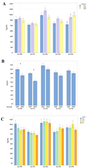 Soil Ca concentrations of ‘Ray Ruby’ grapefruit grafted on ‘Kuharske’ citrange planted in flatwood soils located in Fort Pierce, FL, USA, in response to (A) planting density, (B) ground-applied fertilizer and (C) foliar fertilizer treatments during September 2020 (T0), January 2021 (T1), May 2021 (T2), September 2021 (T3) and January 2022 (T4). Bars are ± standard deviation of the mean. Treatments with * and different letters were considered to be significantly different (p < 0.05).