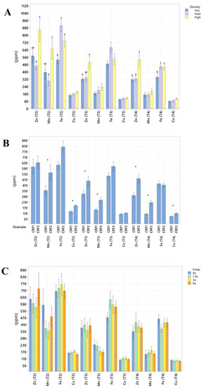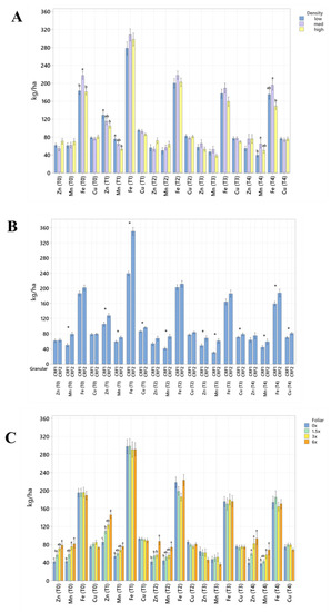 Soil micronutrient concentrations of ‘Ray Ruby’ grapefruit grafted on ‘Kuharske’ citrange planted in flatwood soils located in Fort Pierce, FL, USA, in response to (A) planting density, (B) ground-applied fertilizer and (C) foliar fertilizer treatments during September 2020 (T0), January 2021 (T1), May 2021 (T2), September 2021 (T3) and January 2022 (T4). Bars are ± standard deviation of the mean. Treatments with * and different letters were considered to be significantly different (p < 0.05).