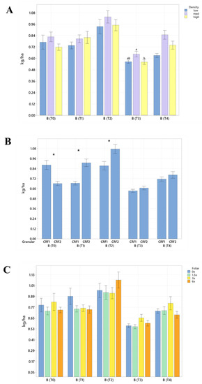 Soil boron concentrations of ‘Ray Ruby’ grapefruit grafted on ‘Kuharske’ citrange planted in flatwood soils located in Fort Pierce, FL, USA, in response to (A) planting density, (B) ground-applied fertilizer and (C) foliar fertilizer treatments during September 2020 (T0), January 2021 (T1), May 2021 (T2), September 2021 (T3) and January 2022 (T4). Bars are ± standard deviation of the mean. Treatments with * and different letters were considered to be significantly different (p < 0.05).