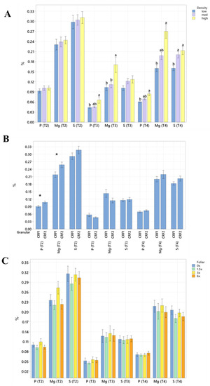 Root P, Mg and S concentrations of ‘Ray Ruby’ grapefruit grafted on ‘Kuharske’ citrange planted in flatwood soils located in Fort Pierce, FL, USA. Graphs indicate response to (A) planting density, (B) ground-applied fertilizer and (C) foliar fertilizer treatments during May 2021 (T2), September 2021 (T3) and January 2022 (T4). Bars are ± standard deviation of the mean. Treatments with * and different letters were considered to be significantly different (p < 0.05).