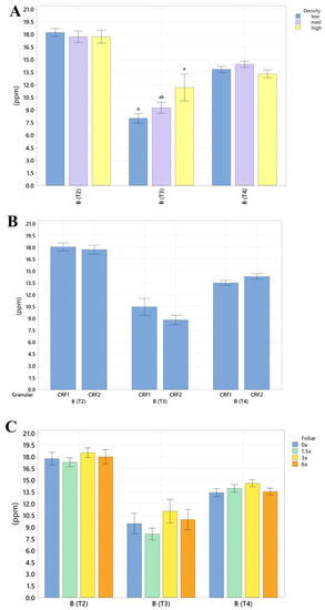 Root B concentrations of ‘Ray Ruby’ grapefruit grafted on ‘Kuharske’ citrange planted in flatwood soils located in Fort Pierce, FL, USA. Graphs indicate response to (A) planting density, (B) ground-applied fertilizer and (C) foliar fertilizer treatments during May 2021 (T2), September 2021 (T3) and January 2022 (T4). Bars are ± standard deviation of the mean, and treatments with different letters were considered to be significantly different (p < 0.05).