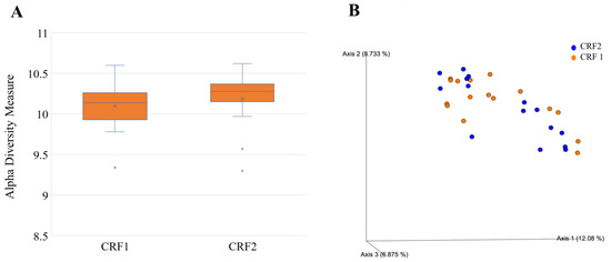 Alpha (A) and beta diversity (B) in rhizosphere bacteria of ‘Ray Ruby’ grapefruit grafted on ‘Kuharske’ citrange planted in flatwood soils located in Fort Pierce, FL, USA, and grown with different ground-applied fertilizer treatments. Alpha diversity was measured using the Shannon index of rhizosphere bacteria among treatments. Plotted in Figure (A) are boxes (interquartile), the median (line within each box), the mean (× within each box), and whiskers (lowest and greatest values). Principal coordinates analysis (PCoA) based on the Bray–Curtis dissimilarity matrix of rhizosphere bacterial samples can be found in Figure (B), where colors indicate treatment and include CRF1 (orange) and CRF2 (blue).