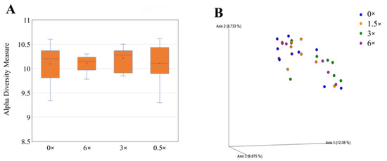 Alpha (A) and beta diversity (B) in rhizosphere bacteria of ‘Ray Ruby’ grapefruit grafted on ‘Kuharske’ citrange planted in flatwood soils located in Fort Pierce, FL, USA, and treated with various doses of foliar fertilizer applications. Alpha diversity was measured using the Shannon index of rhizosphere bacteria among treatments. Plotted in Figure (A) are boxes (interquartile), the median (line within each box), the mean (× within each box), and whiskers (lowest and greatest values). Principal coordinates analysis (PCoA) based on the Bray–Curtis dissimilarity matrix of rhizosphere bacterial samples can be found in Figure (B), where colors indicate treatment and include 0× (blue), 1.5× (orange), 3× (green) and 6× (purple) the UF/IFAS recommended.