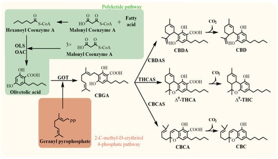Biosynthesis of major phytocannabinoids. OLS, olivetol synthase; OAC, olivetolic acid cyclase; GOT, geranylpyrophosphate:olivetolate geranyltransferase; CBDAS, cannabidiolic acid synthase; THCAS, tetrahydrocannabinolic acid synthase; CBDAS, cannabichromenic acid synthase; CBGA, cannabigerolic acid; CBDA, cannabidiolic acid; ∆9-THCA, ∆9-tetrahydrocannabinolic acid; CBCA, cannabichromenic acid; CBD, cannabidiol; ∆9-THC, ∆9-tetrahydrocannabinol; CBC, cannabichromene [11,12].