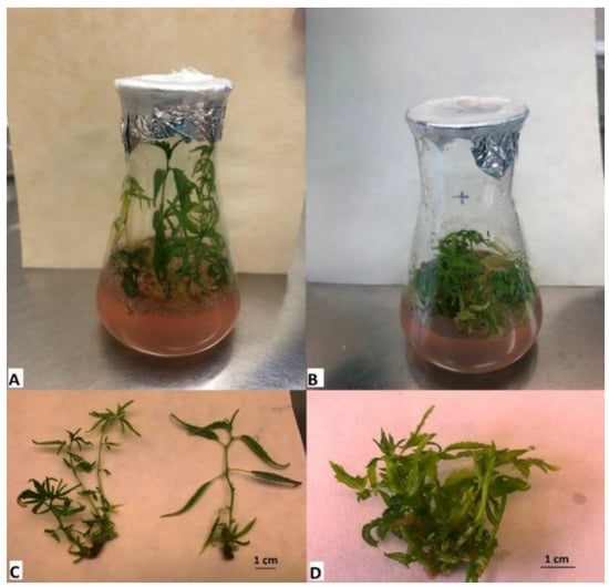 Comparison of experimental variants of the cultivar ‘USO-31’ after 4 weeks of cultivation in Erlenmeyer flasks. It is visible that the control variant showed greater apical dominance and elongating shoot growth (A,C), while the growing variant on the medium with the presence of PEO-IAA showed a lower growth with limited apical dominance and more developed lateral shoots (B,D).