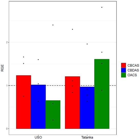 Bar plots show mean values of the given RGEs (CBDAS, CBCAS, and OAC) of the experimental variant Cannabis sativa ‘USO 31’ (without the outliers) and ‘Tatanka Pure CBD’ cultivars. The points represent the concrete values. Expression data were normalised using Act as a housekeeping gene, and the experimental variant was calibrated relative to the control variant (RGEs of the control variants = 1). No statistically significant differences (at statistical significance level α = 0.05) were found between the analysed variants.