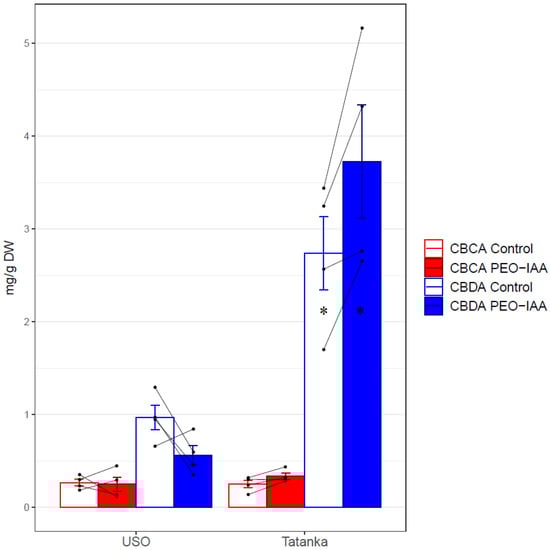 Bar plots show mean values and standard errors of the given concentration for both cultivars ‘USO-31’ and ‘Tatanka Pure CBD’. The points represent the concrete values. The matching samples are connected by lines. Significant differences in the concentrations of CBDA are represented by asterisks (p ≤ 0.05 “*”).