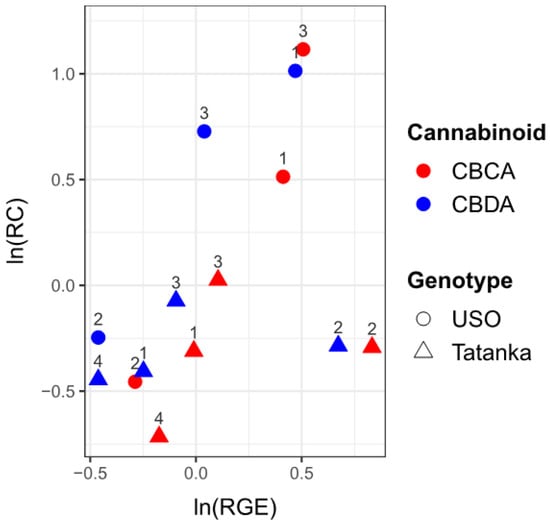 Next, we examined the relationship between RGE and RC of CBCA and CBDA. The regression model ln(RC) = β0 + β1 ln(RGE) + β2 CCBDA +β3 GTatanka + ε was considered, where βj, j = 0, …, 3 are unknown regression coefficients, ε is the random error term, and CCBDA and GTatanka are dummy variables indicating the cannabinoids, respectively, and genotype (0 for CBCA and 1 for CBDA, respectively, 0 for USO and 1 for Tatanka). Robust LTS (least trimmed squares) estimation of the regression parameters was performed.