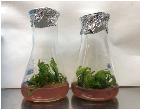 The in vitro cultures from the cultivar ‘USO-31’ were established by in vitro seed germination. The seeds were placed in a sterile beaker (100 mL) and surface-sterilized with 96% ethanol (v/v) by shaking at 135 rpm for 2 min. The seeds were then rinsed with sterile distilled water in an air-laminar box, and shaken with 10% sodium hypochlorite (v/v) and a drop of wetting agent (Tween20) for 30 min at laboratory temperature. Finally, the seeds were rinsed three times with sterile distilled water [27]. Seed germination was performed on solidified ½ strength MS medium including vitamins [40] (Duchefa Farma B.V., Haarlem, The Netherlands) (pH 5.8) supplemented with sucrose, 30 g·dm−3; plant agar, 8 g·dm−3; ascorbic acid, 0.02 g·dm−3; indole-3-butyric acid (IBA), 1 × 10−5 g·dm−3; 6-benzylaminopurine (BAP), 1 × 10−5 g·dm−3. The surface-sterilized seeds were germinated in 100 mL Erlenmeyer flasks containing 6 seeds each in a phytotron at 22 °C at 40% relative humidity for 3 days in darkness. The light regime was then changed to a 16/8 photoperiod (36 μmol m−2 s−1). Seedlings that had reached a height of 5–6 cm were transplanted to the 100 mL sterile Erlenmeyer flasks containing solidified culture medium with a composition as follows: ViVi 6 medium (Duchefa Farma B.V., Haarlem, Netherlands), 6.17 g·dm−3; sucrose, 30 g·dm−3; plant agar, 5.5 g·dm−3; ascorbic acid, 0.02 g·dm−3; thidiazuron (TDZ) (filter sterilized), 1 × 10−4 g·dm−3. The medium was also augmented with antibiotics (ampicillin, 0.133 g·dm−3; chloramphenicol, 0.066 g·dm−3) for controlling endogenic bacterial contamination. Antibiotics were dissolved in 0.002 dm−3 of dimethyl sulfoxide (DMSO) and filter sterilized. Cultivation of the ‘USO-31’ cultivar on ViVi 6 media was carried out for several months, with passage on fresh media every two weeks until the required amount of biomass for the further experiment was achieved (Figure 7).