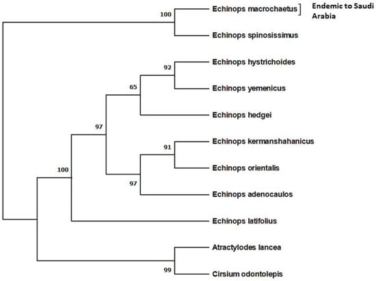 Phylogenetic reconstruction of Echinops macrochaetus with other species of Echinops using Maximum Parsimony method.
