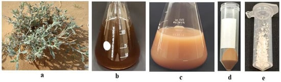 Biosynthesis of ZnO-NPs using the aqueous leaf extract of Heliotropium bacciferum: (a) H. bacciferum in natural habitat; (b) aqueous leaf extract; (c) synthesized ZnO-NPs; (d) ZnO-NPs in pelleted form with secondary metabolites; (e) powder form of synthesized ZnO-NPs.