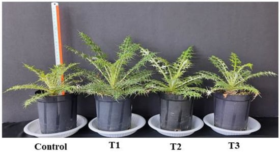 Four-week-old E. macrochaetus plants grown in pots were irrigated with different concentrations of ZnO-NPs (100 mL each pot) (C = 0 mg/L, T1 = 10 mg/L, T2 = 20 mg/L and T3 = 40 mg/L per month), and another time with double-distilled water (100 mL per pot) every after fifteen days. The plants treated at different concentrations of ZnO-NPs showed variation in growth and morphological traits (Figure 4).