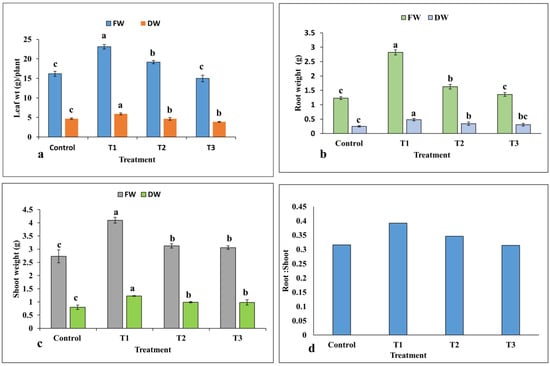 The highest fresh and dry weights of leaves and roots were recorded at the lowest concentration of ZnO-NPs in treatment T1 at 10 mg/L ZnO-NPs compared to the control group (Figure 6a,b). However, the root dry weight was observed to be non-significant between treatments T2 and T3. As with the leaf and root results, shoot fresh and dry weights were increased significantly under different concentrations of ZnO-NPs compared to the control group (Figure 6c). The highest shoot weight (4.09 g per plant) was observed in treatment T1, whereas no significant difference was recorded between treatment T2 and T3. The root and shoot dry weight ratio was found to be the highest in treatment T1, and thereafter it was decreased in all treatments (Figure 6d).