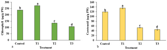 Effects of ZnO-NP on photosynthetic pigments: (a) total chlorophyll; (b) carotenoid content. Treatments including control (0 mg/L, ZnO-NPs); T1 (10 mg/L, ZnO-NPs); T2 (20 mg/L, ZnO-NPs) and T3 (40 mg/L, ZnO-NPs). Different letters designate a significant difference by Duncan’s multiple range tests at p < 0.05.