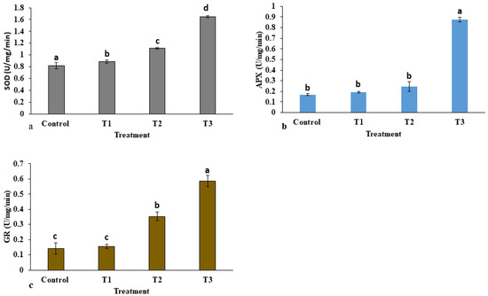 The activities of antioxidant enzymes in E. macrochaetus under different treatment doses of ZnO-NPs are shown in Figure 8. The antioxidant enzyme activities were enhanced at high concentrations of ZnO-NPs, leading to the removal of free radicals from the cell. Compared to the control group, the activity of the SOD enzyme in the leaves under ZnO-NP treatment was increased significantly, and it was observed in a dose-dependent manner. The SOD activity (1.63 U/mg/min) was highest at 40 mg/L ZnO-NPs compared to the activity reported in the control group. However, the activity of the APX enzyme was non-significantly increased in treatments T1 and T2 compared to the control group. There were higher points recorded in APX activity in treatment T3 (0.875 U/mg/min) than in the control group. A non-significant difference was observed in GR activity in treatment T1 compared to control. However, GR activity was significantly increased in treatments T2 and T3 as compared to control.