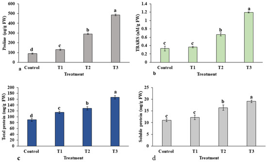 Effect of ZnO-NPs on accumulation of various biochemicals in the leaves of E. macrochaetus: (a) proline content; (b) TBARS content; (c) total protein content; (d) soluble protein content. Treatments including control (0 mg/L ZnO-NPs); T1 (10 mg/L, ZnO-NPs); T2 (20 mg/L, ZnO-NPs) and T3 (40 mg/L, ZnO-NPs). Bars represented by different letters indicate significant values according to Duncan’s test (p < 0.05).
