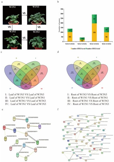 Gene expression was analyzed in potato root and leaf tissues using pairwise comparisons of treatment groups, namely W1N3 vs. W3N3; W1N1 vs. W3N1; W3N1 vs. W3N3; and W1N1 vs. W1N3. A total of eight sets of DEGs were identified from the four treatment group comparisons in two tissues (Figure 1a). The W1N1 vs. W1N3 comparison showed the largest number of DEGs. In both leaves and roots, there were more DEGs between treatments with variations in nitrogen levels than between treatments with variations in water levels (Figure 1b). A crossover analysis of DEGs revealed that there were 14 DEGs in leaves that responded to changes in both water and nitrogen (Figure 1c, Supplementary Table S3); in roots, that number increased to 19 DEGs (Figure 1d, Supplementary Table S4). In potato leaves and roots, there were 693 and 1224 DEGs, respectively, between nitrogen treatments and 287 and 438 DEGs, respectively, between water treatments. These data indicated that there were more DEGs in response to changes in nitrogen levels than water levels and that there was an interaction between responses to water and nitrogen. The common DEGs (14 DEGs in leaves, 19 DEGs in roots) may, therefore, mediate the interaction. TFs in the DEG sets were analyzed. These TFs were found to have a mutual regulatory relationship. The connectivity was higher for TF regulatory networks in potato roots than in leaves, although there was some crosstalk between the regulatory networks in the two tissues. MIKC_MADS (PGSC0003DMT400063312) was differentially expressed in both roots and leaves in response to increased nitrogen (W1N1 vs. W1N3), indicating that MIKC_MADS played an important role in nitrogen regulation in at least two tissues (Figure 1e,f).