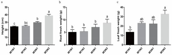 Plant growth indexes under varied water and nitrogen treatments. (a) Plant height of each treatment group. (b,c) Root fresh weight (b) and leaf fresh weight (c) of each treatment group. Values on bar are mean ± standard error (n = 9). Different letters indicate significant differences (p < 0.05).
