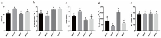 Leaf physiological characteristics associated with photosynthesis. (a–e) The relative chlorophyll content (a), net photosynthetic rate (b), saturated vapor pressure difference (c), stomatal conductance (d), and intercellular CO2 concentration (e) of each treatment group. Values on bar are mean ± standard error (n = 9). Different letters indicate significant differences (p < 0.05).