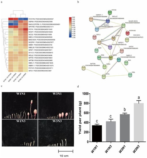 Potato tuber development in response to variations in water and nitrogen levels (a) Heatmap showing expression of tuber development-related genes in response to changes in water and nitrogen levels. (b) Protein interaction network. In the network, the circular node with a specific number represents the protein, and the interconnecting lines represent the source by which protein interactions are derived. Sources of protein interaction were represented with black, pink, green, and blue lines that represent co-expression, experimental data, text mining, and homology, respectively. (c) Tuber development during tuber expansion in each treatment group. (d) Yield of each treatment group. Values on bar are mean ± standard error (n = 9). Different letters indicate significant differences (p < 0.05).