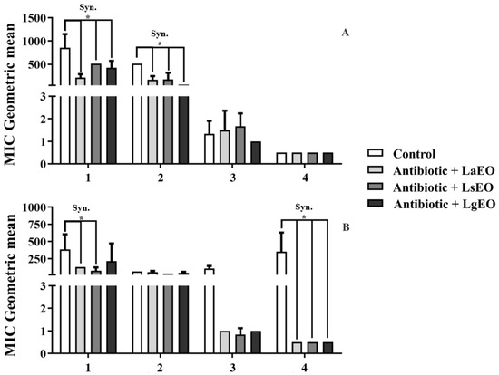 Effects of the essential oils of L. alba (LaEO), L. sidoides (LsEO), and L. gracilis (LgEO) on the antibiotic activity of amikacin (1), gentamicin (2), benzylpenicillin (3), and cephalothin (4) against Staphylococcus aureus Sa 358 (A) and Escherichia coli Ec 27 (B). Syn.: synergism; *: p < 0.05 (ANOVA and Bonferroni’s post-test).
