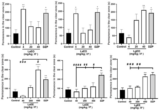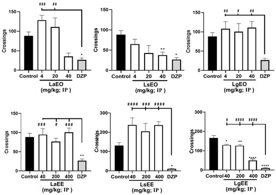 The anxiolytic effect of essential oils and ethanolic extracts of L. alba, L. sidoides, and L. gracilis in the light/dark test (0–5 min). The values represent the mean ± standard error of mean of six animals/group; ANOVA followed by Tukey’s test (* p < 0.05, ** p < 0.01, *** p < 0.001, **** p < 0.0001, vs. control; # p < 0.05, ## p < 0.01, ### p < 0.001, #### p < 0.0001 vs. DZP). LaEO: Lippia alba essential oil; LsEO: Lippia sidoides essential oil; LgEO: Lippia gracilis essential oil; LaEE: Lippia alba ethanolic extract; LsEE: Lippia sidoides ethanolic extract; LgEE: Lippia gracilis ethanolic extract; DZP: diazepam.