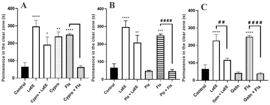 Effects of the pre-treatment with cyproheptadine (A), pizotifen (B), and granisetron (C) in the anxiolytic effect of L. alba ethanolic extract through the light/dark test (0–5 min). The values represent the mean ± standard error of the mean of six animals/group; two-way ANOVA followed by Tukey’s test (* p < 0.05, ** p < 0.01, *** p < 0.001, **** p < 0.0001, vs. control; ## p < 0.01, #### p < 0.0001 vs. Flx or Lippia). LaEE: Lippia alba ethanolic extract; Cypro: cyproheptadine; Piz: pizotifen; Gstn: granisetron; Flx: fluoxetine.