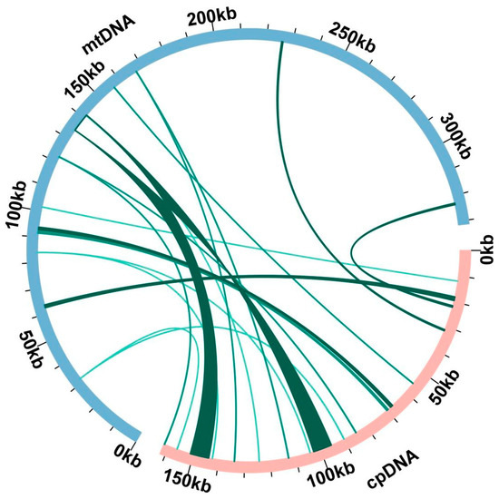 Homological sequences between mitochondrial and chloroplast genomes. The blue circular segment represents the mitochondrial genome, the pink circular segment represents the chloroplast genome, and the green line represents the homologous fragment.