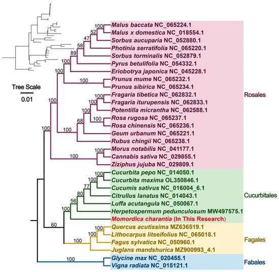 To further explore the evolutionary relationships of mitochondria in bitter gourd, 32 mitochondrial genomes from four angiosperm orders were selected for phylogenetic analysis, including 19 species of Rosales, 7 species of Cucurbitales, 4 species of Fagales, and 2 species of Fabales. There is a lot of structural variety between these species. Therefore, we adopted a shared, conserved PCG tree construction approach. Phylogenetic analysis was performed on 21 PCGs (atp1, atp4, atp6, atp8, ccmB, ccmC, ccmFc, ccmFn, cox1, cox3, nad1, nad2, nad3, nad4, nad6, nad7, nad9, rpl16, rps3, rps4, and sdh4) (Figure 5). According to our analysis, the topological structure of mitochondrial DNA-based phylogeny coincides with the latest APG classification (Angiosperm Phylogeny Group). Bitter gourd, belonging to the Cucurbitaceae family, is closely related to Herpetospermum pedunculosum (Polyphemus).