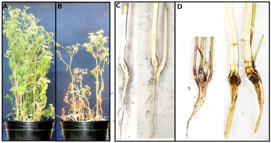 The severity of wilt/root rot diseases was rated after 6 weeks using the indexing method as described by Beale et al. [80]. The roots of coriander plants were washed and divided into five categories according to the percentage of all roots with lesions typical of root rot: zero (0) trace to 10% (1), >10% and ≤30% (2), >30% and ≤60% (3), and >60% (4).