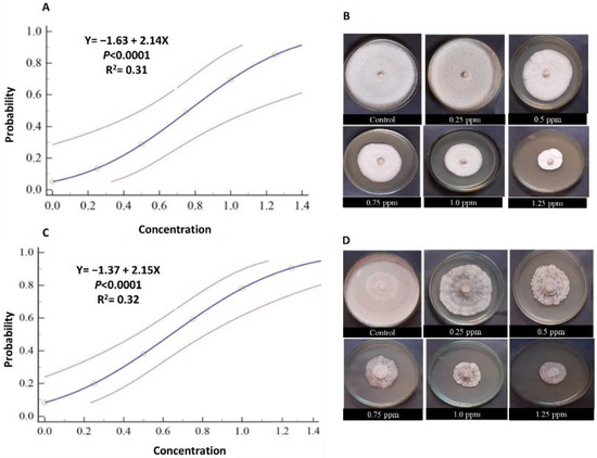 Probit regression analysis of the inhibition effects of Rizolex-T 50% WP (A,B) and Amistar 25% SC (C,D) against R. solani. Each treatment is represented by five replicates (n = 5). The dose–response regression lines are presented as a blue line. R2 and p-value based on the F test (p < 0.05) are shown within the graphs.
