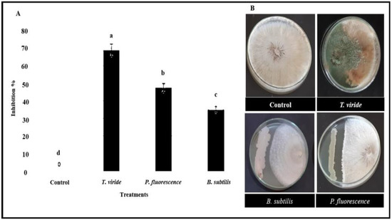The antagonism between T. viride, P. fluorescence, and B. subtilis and the pathogenic fungi R. solani as an inhibitory percentage (A), different letters indicate statistically significant differences among treatments, while the same letters signify no significant differences between them according to Tukey’s honestly significant difference test (p < 0.05). No inhibition was observed in non-treated R. solani compared with noticeable inhibition of the mycelium growth by T. viride, P. fluorescence, and B. subtilis (B).