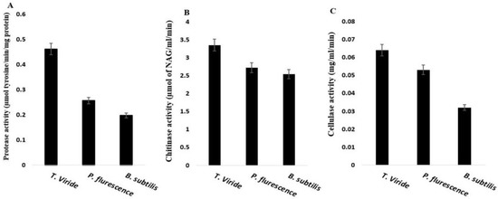 Production of cell-wall degrading enzymes; (A) cellulase, (B) chitinase, (C) protease of T. viride, P. fluorescence, and B. subtilis. Values presented as the means ± the standard deviation of five replicates.