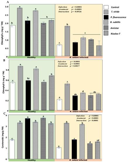 The data of the present work depicted a highly significant decline in Chla, Chlb, and carotenoids by R. solani. However, using biocontrol agents (T. viride, P. fluorescence, and B. subtilis) and two fungicides (Rizolex-T50%WP and Amistar 25% SC) exhibited a significant increase in the photosynthetic parameters compared to infected plants. Interestingly, the interactive difference of R. solani and biocontrol agents exerted the highest positive role on photosynthesis. Nevertheless, the magnitude of alleviation was higher than the stressed plants only and could not retain the photosynthetic attributes to that of control plants. Compared with conventional fungicides, applying T. viride significantly alleviated the photosynthetic pigments in healthy and infected plants. A similar effect was observed with the application of B. subtilis on chlorophyll a and b in healthy plants and carotenoids in infected plants. However, no significant effect was observed for P. fluorescence compared with fungicides (Figure 6).