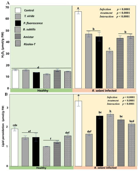 Effects of biocontrol agents on oxidative stress compounds in coriander infected by R. solani. (A) Hydrogen peroxide (µmol g−1 FW), and (B) lipid peroxidation (µmol g−1 FW). Data presented are the means ± the standard deviation (mean ± SD) of five biological replicates. Different letters indicate statistically significant differences among treatments, while the same letters signify no significant differences between them according to a Tukey’s honestly significant difference test (p < 0.05).