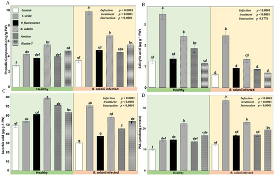 Effects of biocontrol agents on defense-related compounds in coriander infected by R. solani. (A) Total phenolics (µg g−1 FW), (B) salicylic acid (µg g−1 FW), (C) ascorbic acid (ASA) (µg g−1 FW), and (D) phenylalanine ammonia-lyase (PAL; a key SA biosynthesis enzyme) (µmol mg−1 protein). Data presented are the means ± the standard deviation (mean ± SD) of five biological replicates. Different letters indicate statistically significant differences among treatments, while the same letters signify no significant differences between them according toa Tukey’s honestly significant difference test (p < 0.05).