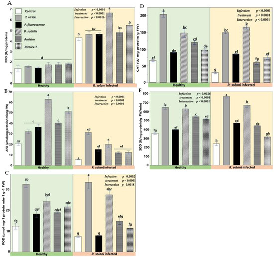Effects of biocontrol agents on enzymatic antioxidant machinery in infected coriander seedlings. (A) Polyphenol oxidase (PPO), (B) ascorbate peroxidase (APX), (C) guaiacol peroxidase (POD), (D) catalase (CAT), (E) superoxide dismutase (SOD). Data presented are the means ± the standard deviation (mean ± SD) of five biological replicates. Different letters indicate statistically significant differences among treatments, while the same letters signify no significant differences between them according to a Tukey’s honestly significant difference test (p < 0.05).