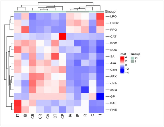 Heatmap analyses for physiological traits of healthy and R. solani-infected coriander treated with biocontrol agents.