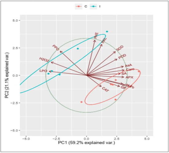 On the other hand, the most striking tolerance exerted by the used biocontrol agents, especially T. viride and B. subtilis, reacted positively by enhancing the level of phenolic compounds and PAL, antioxidants, and SA and negatively by reducing lipid peroxidation, H2O2, and PPO. The PCA of the studied physiological traits showed that two components, PC1 (contributed 59.2% from the whole dataset) and PC2 (sharing 21.1% from the entire dataset), collectively ascribed 90.3% for data variability. Furthermore, it was found that the variables of H2O2, lipid peroxidation, and PPO were strongly connected with stressed plants without any recovery agents. While the variables (CAT, APX, SOD, SA, and Chla) were strongly associated with the upregulation mechanism under various protecting agents.