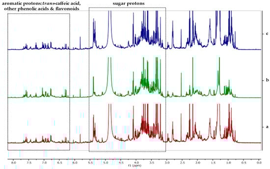 Representative 1H-NMR spectra of the hydromethanolic extracts of Sambucus nigra leaves from genotype GR-1-BBGK-19,596 under (a) no fertilization (control), (b) conventional, and (c) organic fertilization treatments (CD3OD, 500 MHz). Chemical shifts are reported in ppm on the x-axis (0.0–8.0).