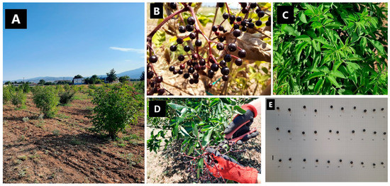 Representative photos of the materials used for phytochemical and physicochemical analyses from cultivated germplasm of Sambucus nigra genotype GR-1-BBGK-19,73. (A) Two-year-old S. nigra plants established at the cultivation trial; (B) ripe S. nigra fruit clusters; (C) composite leaves taken for analysis; (D) collection of fruits; and (E) fruit examination before analysis (inside bar indicates 1 cm).