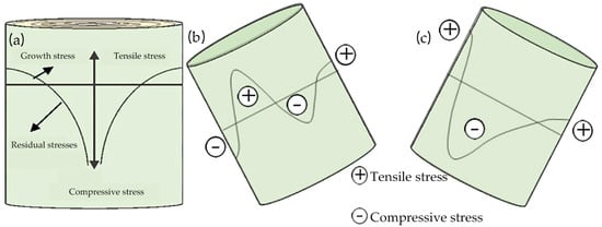 Distributions of longitudinal growth stress and residual stress from pith outwards in trunks [18]: (a) normal wood with symmetrical growth stress; (b) compression wood on the lower face with longitudinal compressive stress; (c) tension wood on the upper face with longitudinal tensile stress.