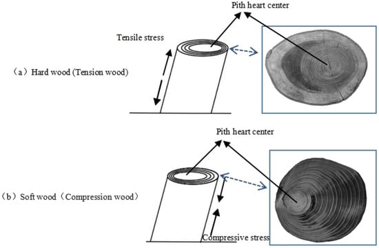 The formation of reaction wood is usually accompanied by eccentric growth (Figure 2), and observing eccentricity is one of the most intuitive methods for detecting the formation of reaction wood [19,20,21]. Generally, reaction wood in hardwood is located on the upper side of a tilted trunk and is called tension wood (Figure 2a); reaction wood in softwood is located on the lower side of a tilted trunk and is called compression wood (Figure 2b) [9,12].